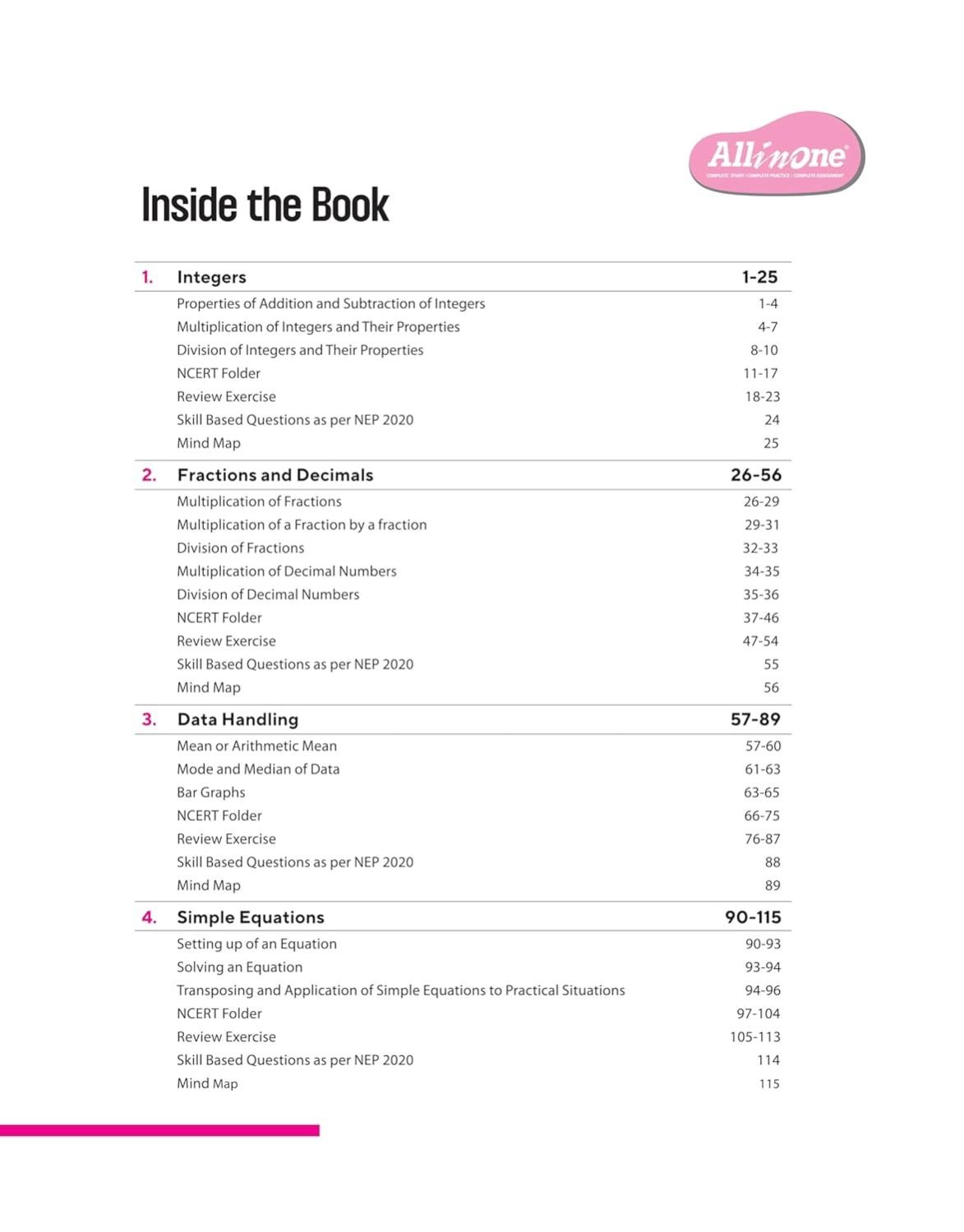 Integers, Fractions and Decimals, Data Handling, Simple Equations, Lines and Angles, The Triangle and Its Properties, Comparing Quantities, Rational Numbers, Perimeter and Area, Algebraic Expressions, Exponents and Powers, Symmetry, Visualising Solid Shapes, 5 Sample Question Papers