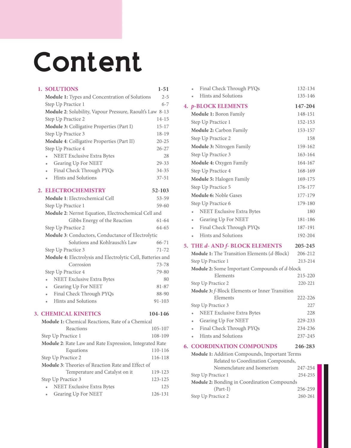 Solutions, Electrochemistry, Chemical Kinetics, p-Block Elements, The d-and f-Block Elements, Coordination Compounds, Haloalkanes and Haloarenes, Alcohols, Phenols and Ethers, Aldehydes, Ketones and Carboxylic Acids, Amines, Biomolecules, Principles Related to Practical Chemistry