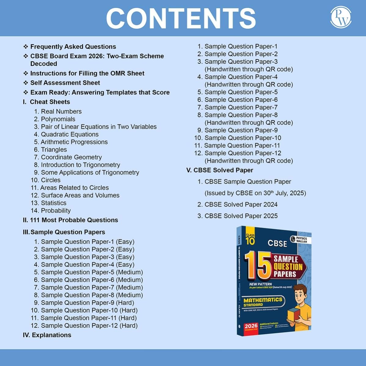 PW CBSE 15 Sample Question Papers Class 10 Mathematics (Standard) For 2026 Board Exam (As Per Latest SQP Dated 30 July 2025) | Mind Maps, 111 Most Probable Questions, Answering Templates